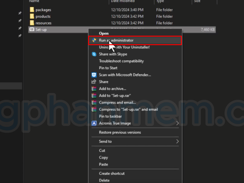 Mở thư mục vừa giải nén, tìm file “Set-up”, nhấp chuột phải và chọn “Run as Administrator” để cấp quyền quản trị viên.